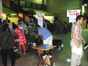 | 「オ肉ヤ果物持ッテマスカ?」「ノー」「オ酒ヤ煙草持ッテマスカ?」「ノー」といった感じで、お互いの母国語が逆転したような奇妙な会話で税関をパス。あ、でもお酒は持っていたっけ・・。空港には現地でお世話になる、ベラウツアーの方々が迎えに来ていました。ここで名前を告げて荷物を預け、「Hinomaru」と書かれたバスに乗り込みます。JALセールス九州の I 江さん率いる我ら6人組はパレイシアホテル・パラオに、JALセールス九州の社員の方々計7名はウエストプラザ・バイ・ザ・シーに宿泊ということで、まずはホテルのあるコロール島中心部へ向けて出発です。 |
