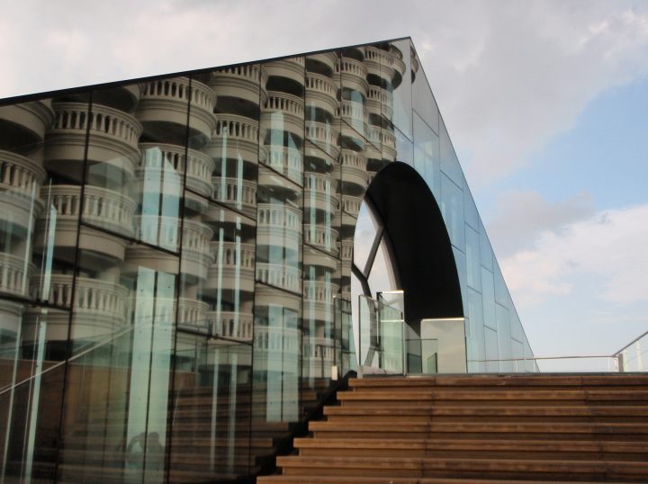 | ダンナ河野は1.の運動着(Athletic Clothing)に抵触しそうなポロシャツを着ていったのですが、エリ付きだったせいか特に何も言われませんでした。海外のレストランやモスクなどに行くと、エリの有無が重視される傾向があるので、何枚かエリつきのものを持っていくと良いでしょう。 客席に降りる階段の下から三角ミラーを見上げると、各スイートルームのバルコニーが美しく映えています(上写真)。スカイブリッジ先端部から、反対側を振り返ってみると、タワー クラブのバルコニーがずらっと並んでいてなかなかに圧巻です。こうした風景も夜はライトアップされるから、さぞ綺麗なことでしょう。さてブリーズからの景色も十分に堪能したので、再びラウンジに戻ることにします。 〔360°ツアーはこちら (公式サイト/英語) 〕(新しいタブが開きます。右の列上から3番目がBreeze) |