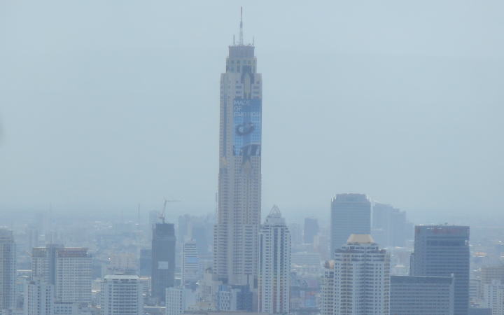 | バイヨーク スカイ ホテル。タイで最も高い建造物で、304mあります。ルブア アット ステート タワーからは北北東方面。エアポート・レール・リンクのラチャプラロップ駅(マッカサンとパヤータイの間)の近くで、近所には無数の屋台が立ち並ぶアーケード街、「プラトゥーナム市場」もあります。客室からは角度の関係で見えませんでしたが、屋外レストランのブリーズからは見ることができます。デジカメのズームを最大にしてみると、はるかかなたの右前方に、他の高層ビル群を圧倒する姿がかすんで見えます。 |