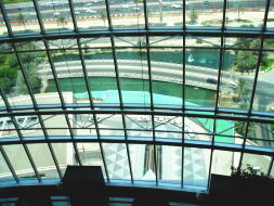 | せっかくホテルに来たのだからツアーデスクでデザートサファリでも申し込んでいこう、ということになりました。とても親切なアラブ服のお兄ちゃんが担当してくれて、結局ひとり250 Dhs.(8,000円くらい)のサファリツアーを申し込みました。4時過ぎに我々の泊まるシェラトン・ドバイ・クリークに迎えの車が来るそうだから、今度は間違えようがないでしょう。ところでこのお兄ちゃん、あまりにも感じが良いので「上の階に登って景色を見れないかな?」と、ダメもとでお願いしてみたところ、「オーケイ・ノープロブレム」ということで担当者を一人つけて登らせてくれました。 |