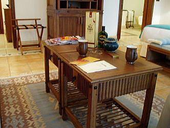 | 午前7時、さっそく散歩に出ましたが、今は真夏のオフシーズン。時差ボケに加えて気温45℃超、湿度約100%に挫折。部屋へ戻ってひとっ風呂浴びることにしました。ガラス戸で囲まれたシャワー室があり、これとは別に大きなバスタブが部屋の中にあります。ハーブの入浴剤がことのほか気持ち良く、バスタブにのんびりと浸かっていると極楽気分で、もう動くのがイヤになります。洗面所も広々としており、可愛らしいデザインのアメニティが並んでいます。大きなクローゼットや収納スペースがあり、荷物をその中にまとめておくことができたので、部屋も散らかりません。 |