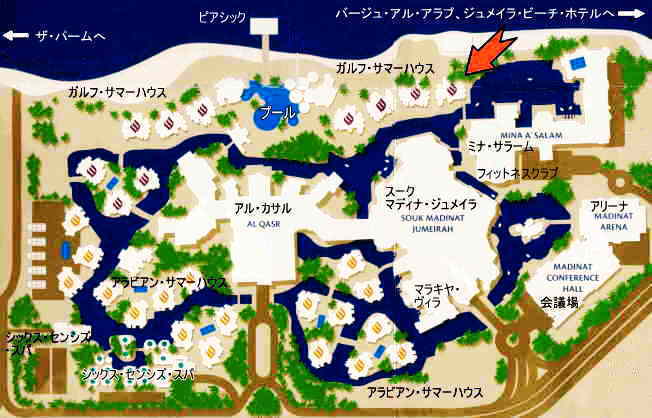 | ◇ アル・カサルへ入城 ◇ 車は少し走ると右折して検問所を抜け、マディナ・ジュメイラの敷地内に入りました。目の前に何頭もの馬のオブジェが並び、お城のような大きな建物が迫ってきました。マディナ・ジュメイラの中心部にあるホテル「アル・カサル(アル・カスル)」です、ここで車を降りました。ダル・アル・マシャフはヴィラ形式のホテルなので、このアル・カサルで受付を済ませ、宿泊するヴィラに移動してチェックインするのです。みごとな調度品の並ぶ広い部屋に通され、椅子に座っておしぼりやドリンクを手にしばらく待ちます。ダンナ河野は本当に自分が今アル・カサルにいるのが信じられず、感動して鳥肌ぶつぶつ状態。担当してくれたサミュエル・L・ジャクソン似の大男は部屋の中央にある大きなデスクに座り、しばらくあちこちに電話をかけた後、我々のところに戻ってきました。何とすぐに部屋に入れるばかりか、部屋をアップグレードしてくれるそうです。日本で予約した時点ではダル・アル・マシャフの「アラビアン・サマーハウス」というリゾートビューのヴィラでしたが、「ガルフ・サマーハウス」という海寄りのヴィラに替えてくれました。(マディナ・ジュメイラの見積もり例はこちら!) 下の地図がマディナ・ジュメイラの全体図です。クリーク(水路)の周りに建っているオレンジ色の印がついたヴィラがアラビアン・サマーハウス、海側にあって紫色の印がついた建物がガルフ・サマーハウスです。そして赤い矢印のついているのが、我々の宿泊する1号ヴィラで、ミナ・サラームのすぐ近くにあります。この矢印を180度ひっくり返した方向にバージュ・アル・アラブが見えます。 |