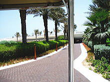 | 高鳴る胸の鼓動を抑えつつ、「早く着きたい・・・けど、もっとゆっくり走って欲しい」という相反する気持ちで前方の写真を撮っているうちに、あっという間にエントランスに到着してしまいました。今回は懸賞旅行なのでダル・アル・マシャフの宿泊料が一泊分だけ無料になりましたが、バージュ・アル・アラブはもちろん自腹です。何しろわが家の一ヶ月分の家賃より高い一泊分、しっかり目に焼き付けておかなくては・・・。 |