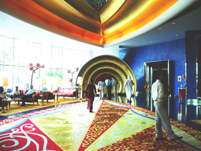 | あまりにも有名になってしまったBAA、すでに高級ホテルというより観光名所という雰囲気です。日本でいえば東京タワーや金閣寺のようなものでしょうか、TシャツやGパンのようなラフな格好の人もいるし、ロビーでなら、田舎者まる出しで写真を撮りまくっていても誰も文句を言いません。そういえば金閣寺は池の上に浮かぶきんきらきん、BAAは海の上に浮かぶきんきらきん、何か共通点があるような気がしてきます。さすがにここまで来ると日本人は見当たりませんが、ダンナ河野以外にも写真やビデオを撮っているアジア系の集団がたくさんいます。 |
