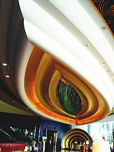 | ◇ 異次元空間との遭遇 ◇ 入口付近は何かの改修工事をやっているらしく、スクリーンで覆われていました。ドバイ歴代首長の肖像画と、さわやかな表情のドア・ボーイたちに出迎えられ、回転ドアを通って中へ入ります。一歩中に入ると、驚くべき異次元空間が広がっていました。 |