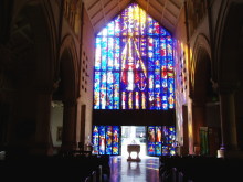 | 教会の中に一歩入ると、そこは写真どおりの荘厳な祭壇と、色鮮やかなステンドグラスの世界です。この教会で一番有名なのは、教会正面の天井まで一面に埋められている巨大なステンドグラスです。教会内から入口の方を向くと、光がステンドグラスを通して本当に美しく差し込みます。ステンドグラスは入口だけでなく、教会側面の窓にもはめられていて、ステンドグラスが好きな人はとっても幸せな気持ちになれそうです。パイプオルガンもありますが、カワイアハオ教会のようにあらわにはなっていません。今回は聴く事ができませんでしたが、沖本さんのお話では、音量は十分でとても美しい音色だそうです。 |