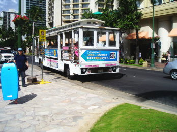 | エバ・タワー2階にあるツアーデスクに降りていくと、ガイドの人が日本人観光客相手にホテルの説明をしていました。聞き耳を立ててみると、何でも「客室内の冷蔵庫には重量センサーがついていますので、自分で買ってきた飲み物などを冷蔵庫に入れておくとあとで課金されますからご注意ください」とのこと。ホントかなあ、天下のハイアットリージェンシーがそんなセコい装置をつけるだろうか。とりあえず冷蔵庫の中身は高いので、あとでABCストアでビール買ってきて試してみよう。ともあれハワイといえばダイヤモンドヘッドに登らなくては・・・ということになり、ワイキキ・ビーチのデューク・カハナモク像の目の前にあるバス停からトロリーバスに乗ることにしました。ところが、トロリーバスは何台もやって来るのに、お目当ての路線のトロリーバスだけがまったく来ません。 |