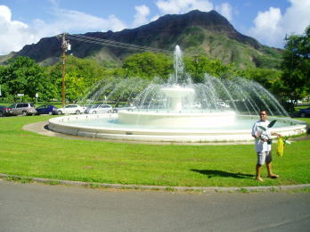 | ハワイといえばダイヤモンドヘッド、まさにオアフ島のシンボル的存在で、ハワイ語ではレアヒ(マグロの額という意味)と呼ばれています。かつて18世紀後半にやってきたヨーロッパ人が、この山の岩石に含まれる方解石の結晶をダイヤモンドと見誤ったため、「ダイヤモンドヘッド」と呼ばれるようになったのだそうな。左下写真はカピオラニ公園の噴水から見たものですが、一見すると普通の山にしか見えません。しかし上空から見ると巨大なすり鉢状のクレーターになっています。これは約30万年前の火山活動によって造られたもので、この直径1.2kmのクレーターを取り囲む外輪山の南西部が標高232mの山頂です。登山口からこの山頂まではハイキングコースになっているので、早速登ってみることにしましょう。 ※Google Earthで上から見てみましょう。→21°15'44.62"N 157°48'21.67"W |