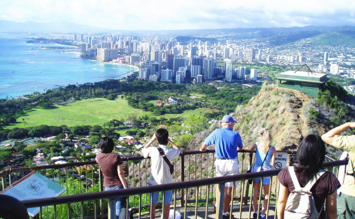 | 目の前にはダイヤモンドヘッド・ビーチの青い海とともに、ココ・ヘッドやワイキキビーチが一望にできる、360度のパノラマ風景が広がっています。このように山頂から全景を一望できることから、ダイヤモンドヘッドは古くからハワイの沿岸防衛の拠点として砦や砲台が造られ、要塞化が進められました。今まで通ってきた道や施設も、大部分がもともと軍事用に造られたものだそうです。 |