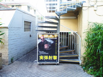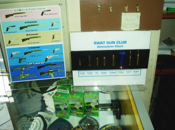 | ダイヤモンド・ヘッドから再びワイキキに戻ってくると、DFSの前で若い金髪のお兄ちゃんがチラシを配っていました。見ると「S.W.A.T GUN CLUB」とあります。「ここから近いの?」と聞くと、「この道を渡って路地を少し入ったところだ・・・」と、近くまで歩きながら教えてくれました。「うちはノーチップだし、これを見せればディスカウントするよ」というので、渡されたチラシを手に、さっそく行ってみることにしました。 ◇ スワット・ガン・クラブ ◇ ワイキキトレードセンター向かい側、クヒオ通りを少し入ったところに、お目当てのスワット・ガン・クラブがあります(Address:2266 Kuhio Avenue 2nd Floor Honolulu, Hawaii 96815)。らせん階段を登って店内に入ると、弾薬の説明や、各コースで使用する銃の写真が貼られています。店内はそれほど広くはありませんが、射撃場は別室に造られていて、ここは受付と待合室兼グッズ売り場のようになっています。さっきチラシを配っていたのが、完璧に地元の人だったので意外でしたが、ここは日本人の経営で、インストラクターも日本人だそうな。 |