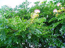 | ちなみにこの木は猿が好んで実を食べることから、「モンキーポッド」という名があります。亜熱帯地方に広く分布しており、夜間や降雨時には葉を閉じるマメ科ネムノキ亜科の木です。学名はSamanea saman、アメリカネムノキとかレインツリーとも呼ばれています。日本でも栽培セット(種と鉢、培養土つき)なんかが売っていて人気があります。「日立の樹オンライン」によると、この木は樹齢130年、高さ25m、幅は40mもあって、幹の周りは7mだそうです。どこから見ても1本の木にしか見えませんが、実際には何本かの木が寄り添っているのだとか。年に2回花を咲かせますが、我々が行ったときもちょうど開花時期だったらしく、先端がピンクに染まった白髪ネギのような可憐な花を咲かせていました。 |