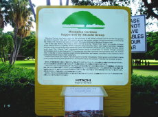 | ◇ 気になる木 ◇ 我々の乗る車はゴールドメタリック色のフォード・トーラスで、なかなか使い勝手が良いです。日本語も含むマルチリンガル機能付きカーナビがあるので頼りになりそうです。けれどもちろん左ハンドルのアメ車、最初はウインカーやスイッチの場所がわからないのと、車両感覚がわからないので戸惑いました。道を走っているとなぜかだんだん車線の右側に寄って行ってしまうので、慌てて軌道修正をします。おまけに右側通行なので、左折するときは奥のほうに大回りして曲がることを忘れないようにしないといけません。さて、チャペル巡りをする前にちょっと「この木何の木・・・」でお馴染みの「日立の樹」を見に行こうということになりました。この木はモアナルア・ガーデンパークの中にあるので、H1ハイウェイを通って201号に抜けて、あれれ?・・・全然違う。どうやらナビの設定を間違えてモアナルア・コミュニティパーク方面に来てしまったようです。少し道に迷ったけど何とか到着、広い敷地内には同じような形の大きな木がたくさん生えていますが、ひときわ枝ぶりが立派で、人がたくさん集まっているのですぐにわかりました。Google Earthをお持ちの方は上からも見てみましょう(21°20'49.53"N 157°53'35.94"W)。 |