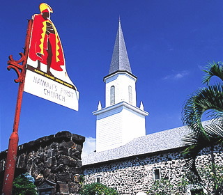| 1820年に創立された、ハワイ諸島最古の由緒ある教会です。現在の建物は1837年に建てられたもので、コナの中心地にあり、王家の別荘”フリヘエ宮殿“(現在は博物館)の前に位置しています。教会の壁は溶岩と珊瑚礁で出来ており、白い尖塔とともに、印象深い外観が街の象徴的な存在にもなっています。内部は歴史の重みを感じさせる造りで、使われている木材はすべて島のもの。教会前の庭には熱帯植物が生い茂り、トロピカルなムードでいっぱいです。クラシカルなハワイアンウエディングをあげたいふたりにおすすめです。 |