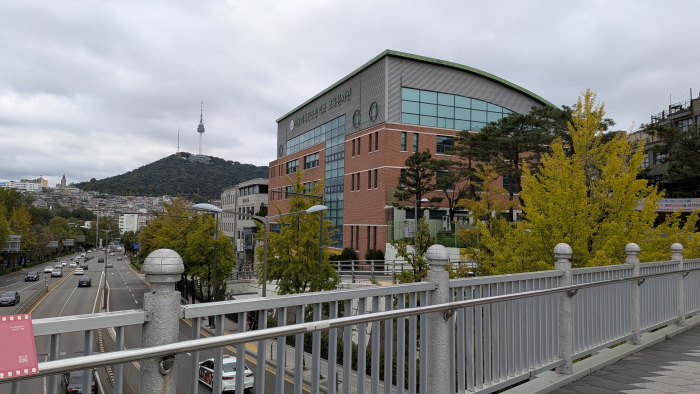 | 「梨泰院クラス」のロケ地となった「緑莎坪(ノクサピョン)陸橋。南山(ナムサン)の頂上付近に建つ、「Nソウルタワー」が見える歩道橋です。 |