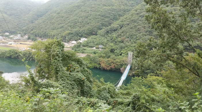 | こちらは阿波池田の宿近くから見た橋。霧立ち上る山に囲まれ、エメラルドグリーンの吉野川にかかっていて、とても美しい。渡りたかったけど、生憎工事中でした。空気が澄んでいて爽やか。 バスツアーに参加してきました。 「大歩危・祖谷(※2) 秘境の旅」 https://miyoshi-tourism.jp/news/23579/ |